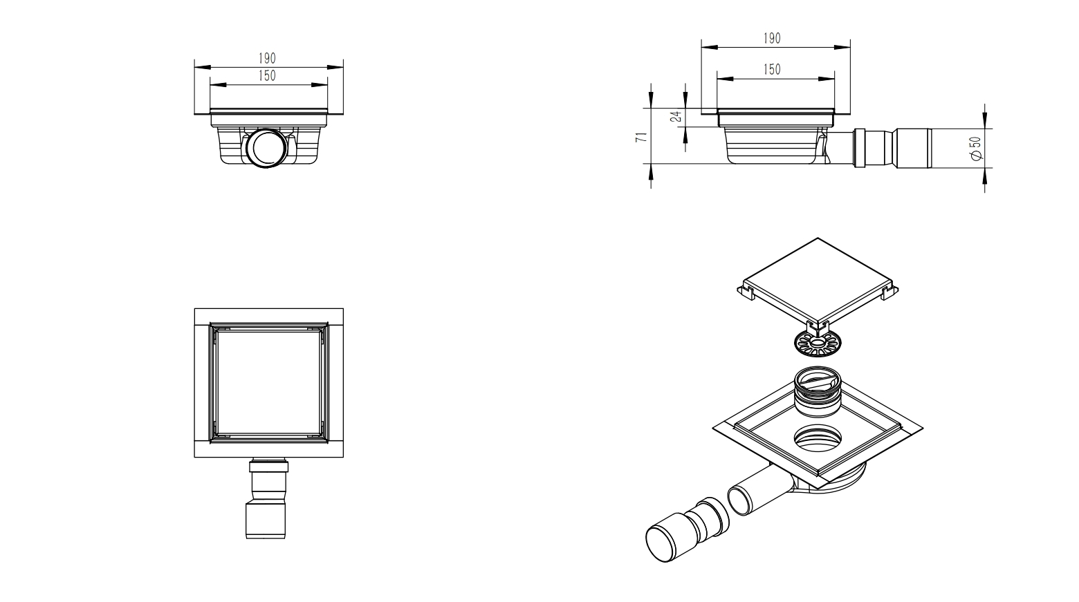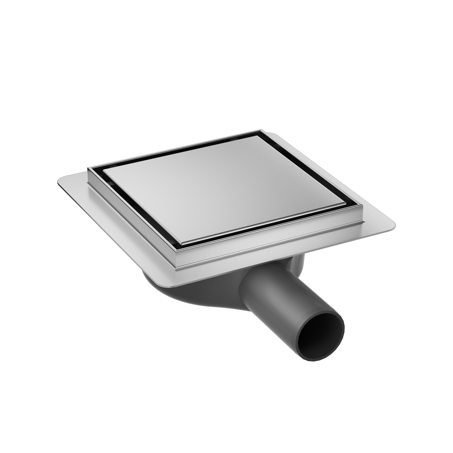Двухсторонний точечный напольный трап с панелью из матовой нержавеющей стали и вращающимся сифоном